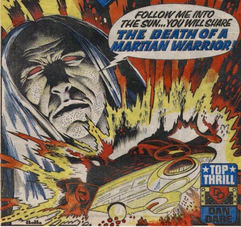 Brian Bolland! All I can say is WOW. The cover is a brilliant depiction of Dan Dare’s Mr. Monday, with a fiery death that awaits the crew. Are they wearing red shirts? More than probably.