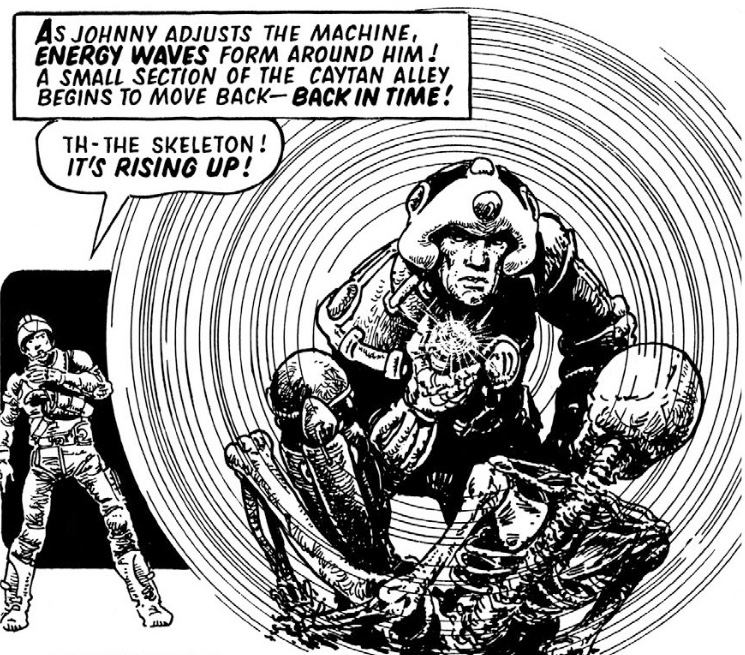 After the vitriol and verbal abuse from the cops have subsided, Johnny traumatizes them by interrogating one of the corpses! He employs the advanced tech all SD agents wield, in this case a TIME DROGUE, to reverse the flow of time and bring the dead man back to life. Here we learn of another pivotal power in Johnny’s arsenal – the power to read men’s souls and minds with his strange Alpha eyes. Playing the part of a living lie detector, Johnny ascertains the current whereabouts of his bounty Max Quirxx before mercilessly flicking off the time drogue. Having witnessed the chilling sight of flesh crawling back on scorched bones mere moments ago, the cops are further scarred when they see Johnny’s victim die a second time; his flesh blasted from his skeleton in a paroxysm of agony!