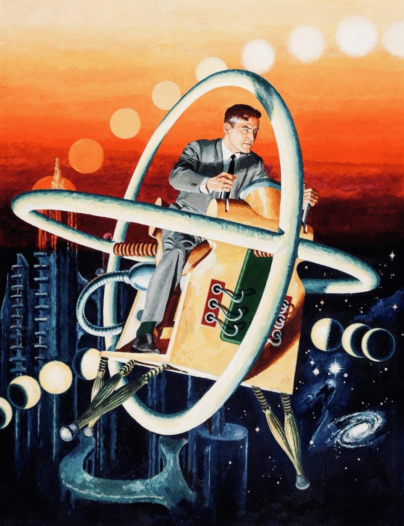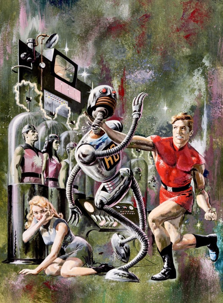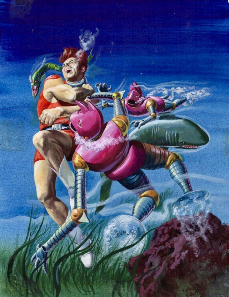 One thing that always impressed me about Wilson’s work was his versatility. In one cover, he’d be painting a prehistoric scene with dinosaurs chasing cave-dwellers. In the next, he’d be depicting a far-future battle between humans and robots. And he tackled each subject with equal skill and enthusiasm.