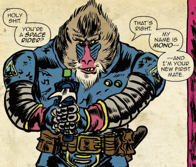 Mono is the ship’s first mate and a genetically engineered baboon/mandrill hybrid. He is a spiritual warrior, combining animalistic strength with a deep sense of honor and mysticism. Mono’s combat skills are matched by his loyalty to Capitán Peligro, and he often serves as the captain’s right hand in battle, providing both muscle and wisdom.