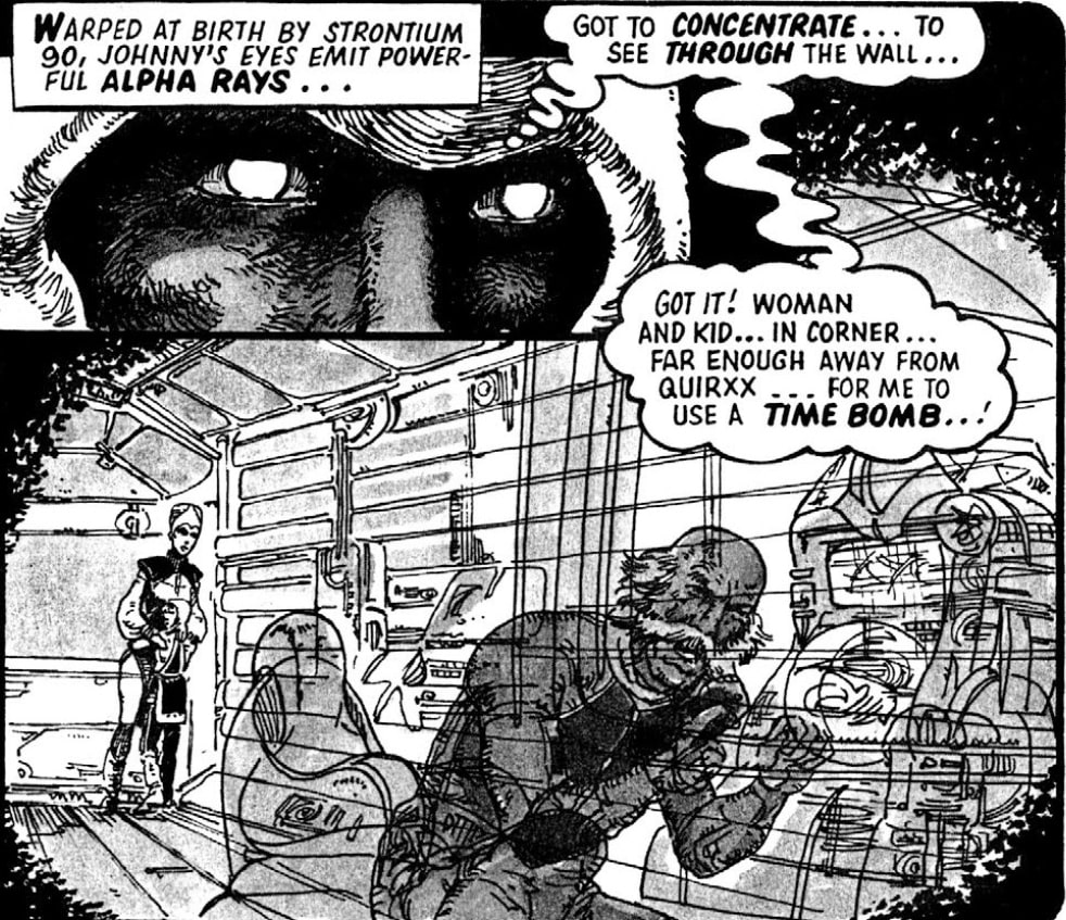 But Johnny’s got those alpha eyes—strontium-90’s gift that lets him see through walls like they’re tissue paper. He spots Quirxx’s exact position and pulls out one of his nastier toys: a time drogue (D-R-O-G-U-E, for those keeping score). While Wulf lays down suppressing fire, Johnny lobs this temporal grenade with surgical precision.