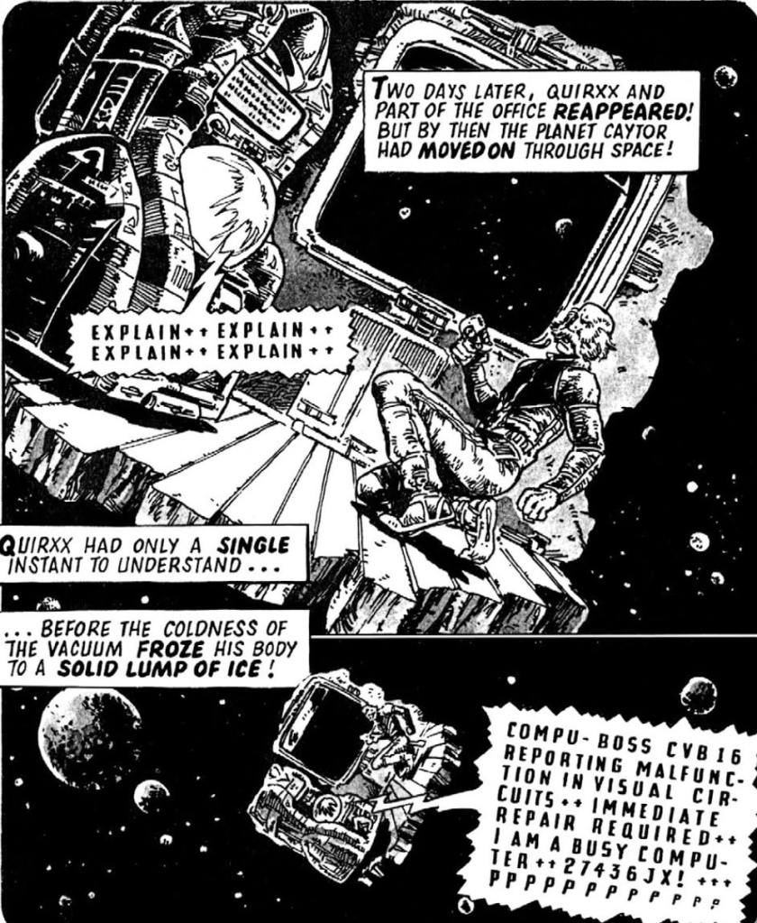 The beauty of the time drogue? It doesn’t kill you. It just displaces you two days into the future. Same spot, different time. Problem is, planets don’t stand still. Two days later, Quirxx materializes exactly where he was standing—except now that spot’s in the cold vacuum of space. Him and that useless education bot, frozen solid and drifting in the void. Justice served, Johnny Alpha style.