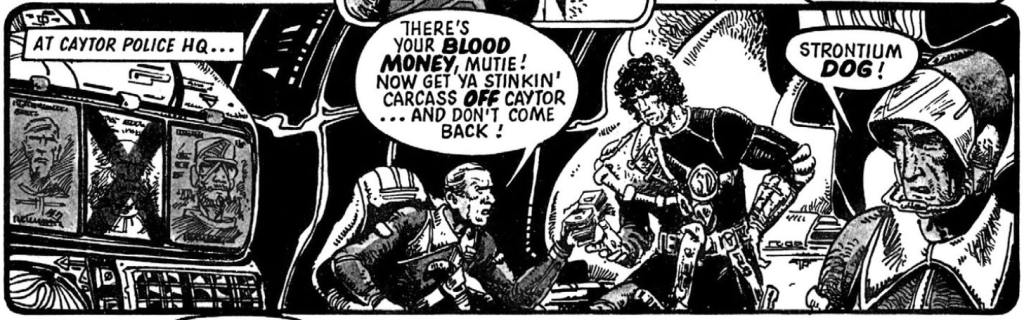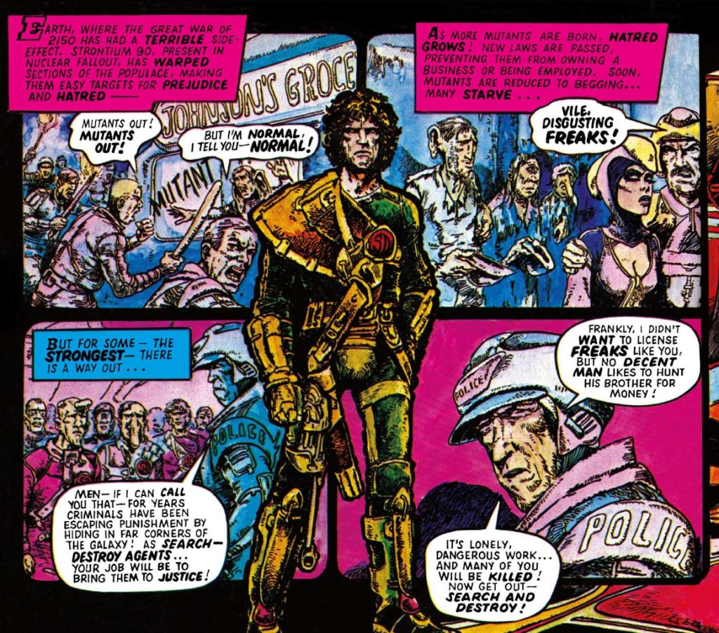 At the local law office, the cops hand over the bounty like they’re handling toxic waste. They spit the name “Strontium Dog” at Johnny like it’s a curse. Standard procedure in this cesspool of prejudice. But what kills me—what really drives home who Johnny is—comes next.